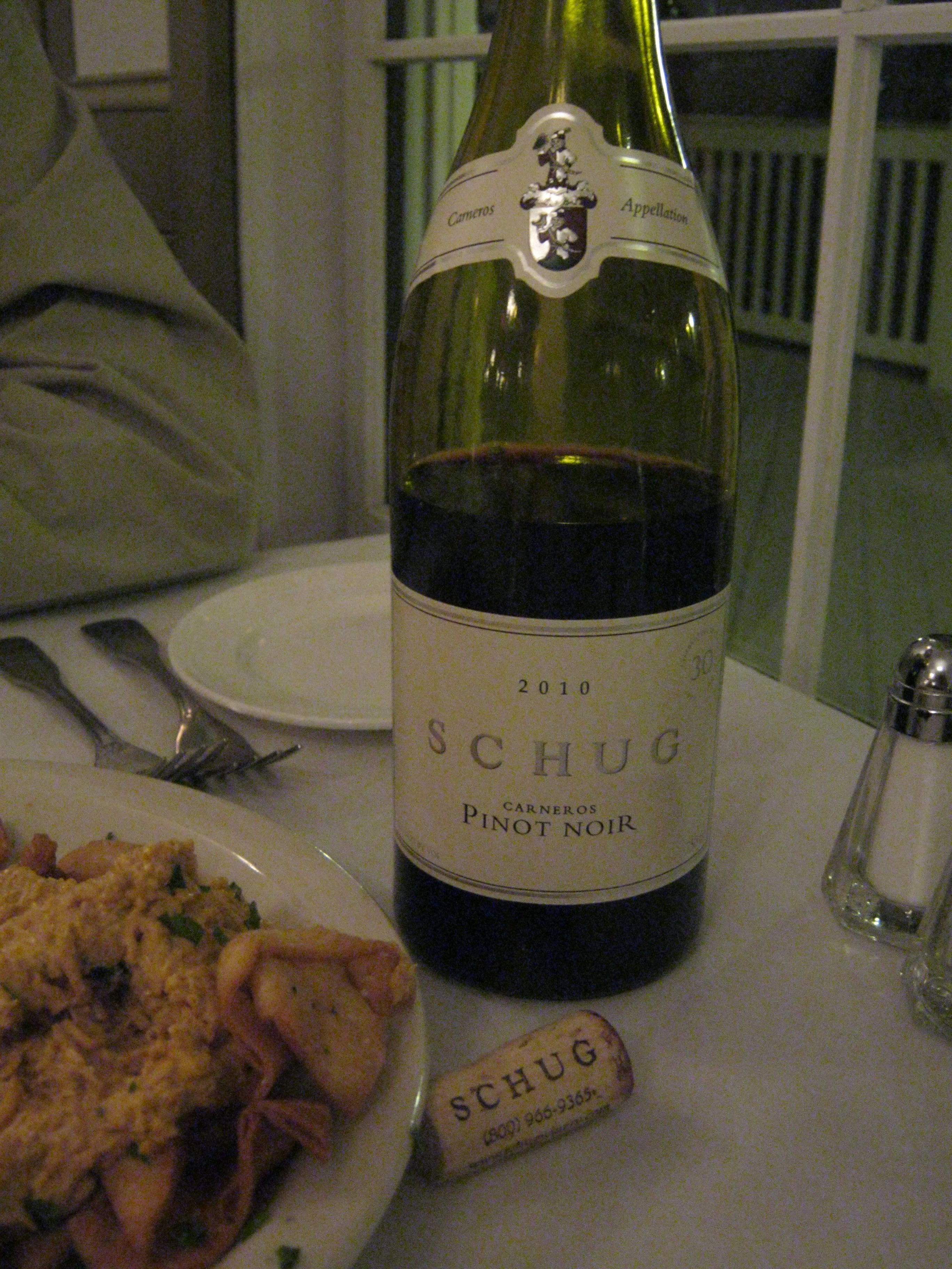 A bottle of Shug, a Sonoma Pinot Noir was enjoyed with the best item we tried on the menu at the Owl Cafe, Apalachicola, Florida – Blue Crab Dip!