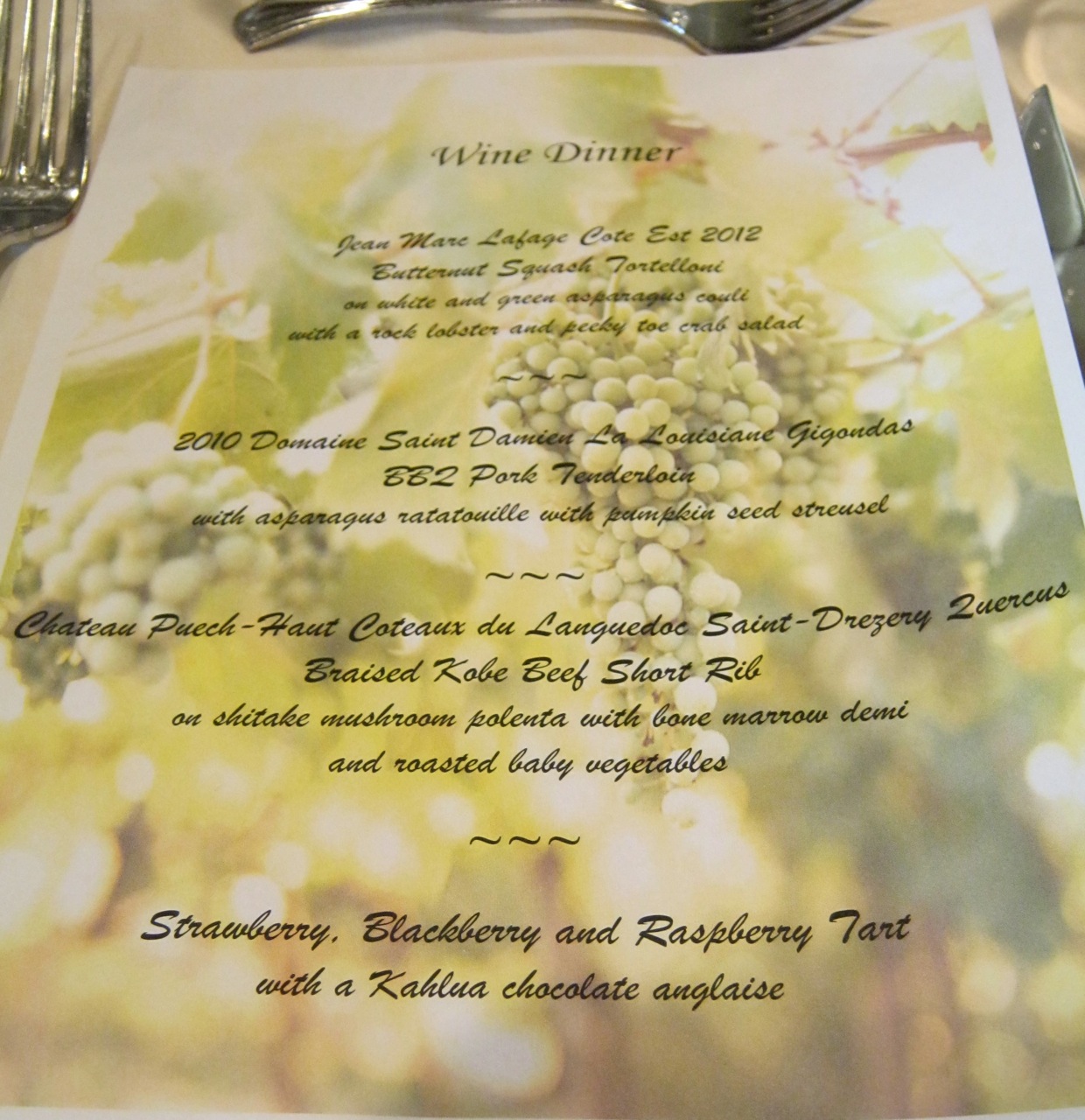 The Barrel 27 “Rock and a Hard Place”, a 2011 Grenache from Paso Robles was chosen to move from the white wines to the reds. It was followed by the 2010 Domaine Saint Damien “La Louisiane” Gigondas and paired with a pork tenderloin course.