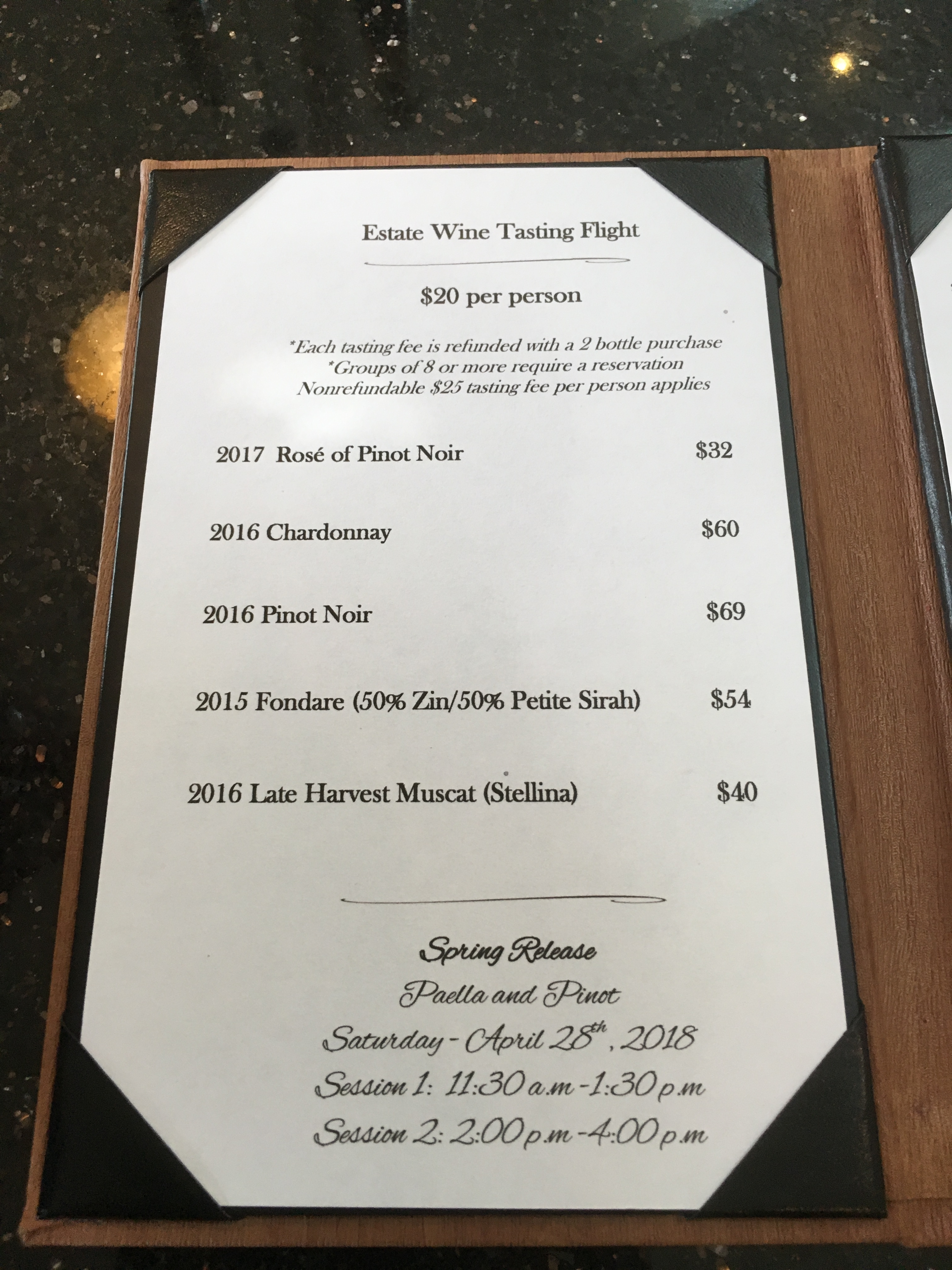 Janice poured for us and kindly let us bring our dog in, leashed of course. Its a great friendly tasting room. We didn’t leave empty handed. The 2017 Rosé Pinot Noir ( very easy to drink!) and a bottle of the 2015 Fondare followed us home!