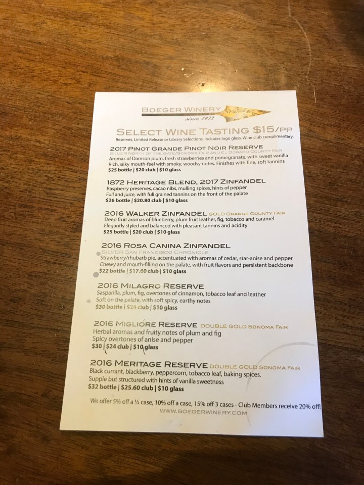 We had a fantastic tasting with Sue while discovering their vast array of varietals. Boeger’s most popular wine is their Barbera but the wines that really stood out for us were the 2017 Cabernet Franc which is an absolute steal at $20, the 2016 Rosa Canina Zinfandel, the 1872 Heritage Blend, and the 2016 Zinfandel.