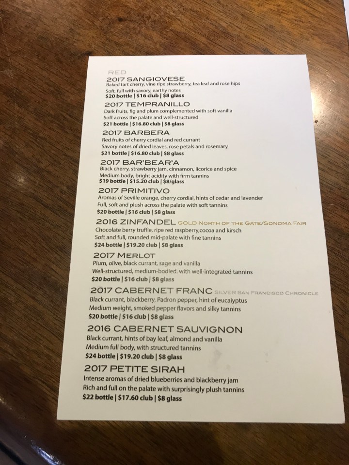 Susan was a terrific host, acquainting us with the winemaker’s approach and with specific wines. Our favorite was the 2017 Petit Verdot from the Damir Ranch in Stanislaus County followed by the 2017 Barbera from Amador County. There was also a 2018 Cabernet Franc from Enver Salaman Vineyards in Clarksburg that we thought was another standout.