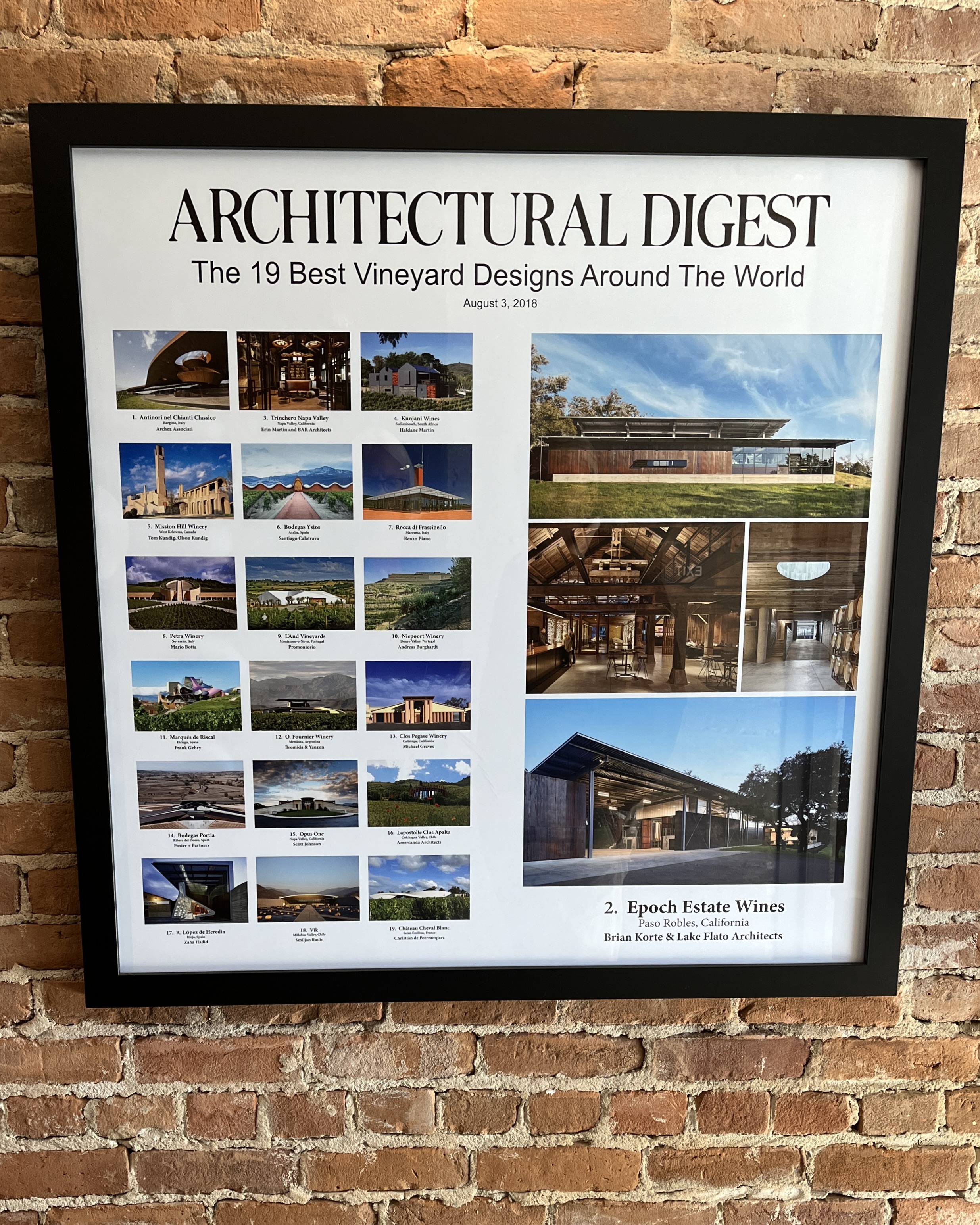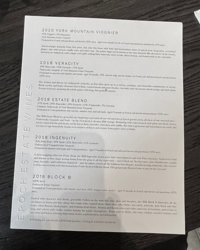 Refortified after a relaxing late night around the fire pit we set off for Epoch Estate Wines. Epoch’s wines are from a combination of Paderewski Vineyard, Catapult Vineyard and York Mountain. The tasting room is on the historic York Mountain Winery property.