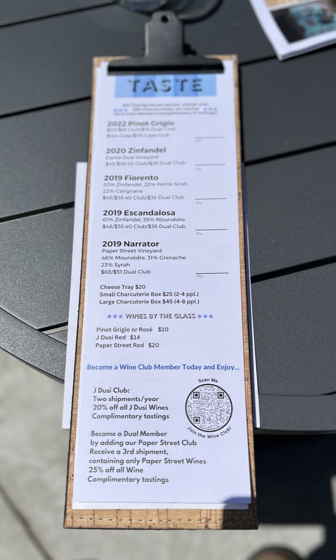 Cara was our host and started us off with a 2022 Pinot Grigio. We tasted down the menu and enjoyed them all. Our favorite though was the 100% Zinfandel from Paper Street Vineyard.