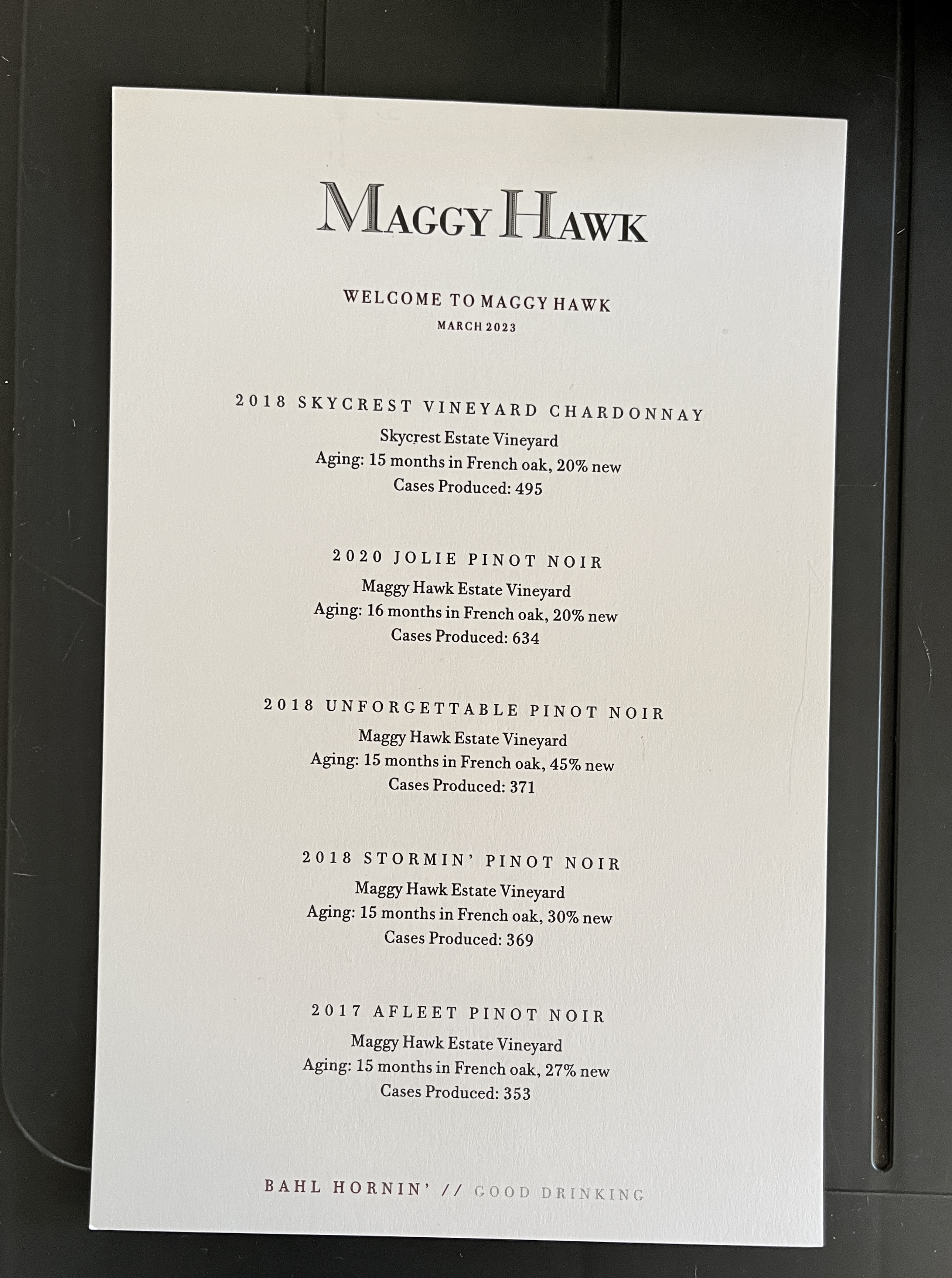 In addition to the tasting menu we also tried a 2017 White Pinot Noir and the Pét-Nat. We did not leave empty handed. Our wine cellar now has Maggy Hawk’s Stormin’ and Unforgettable, both Pinot Noir from the 2020 vintage.