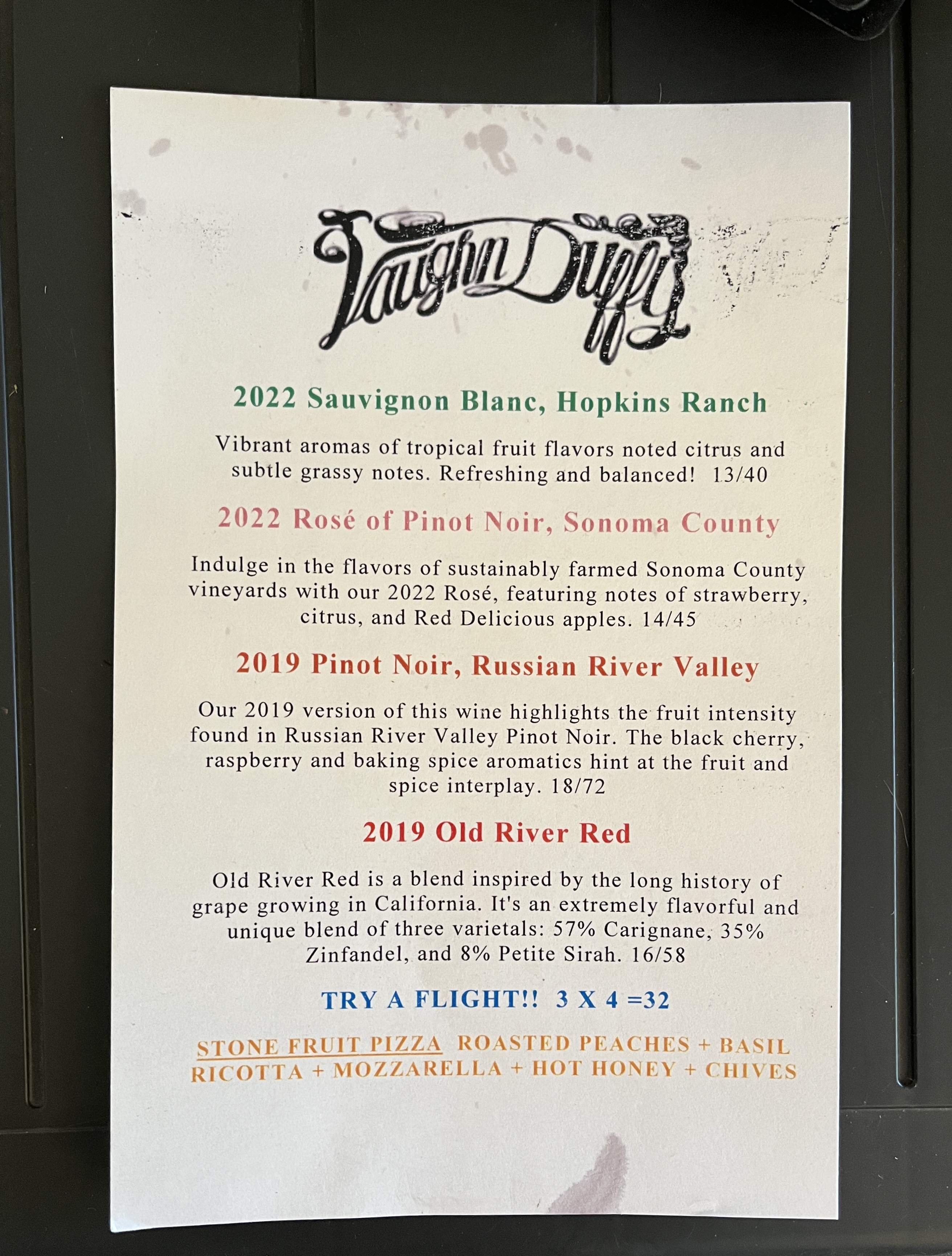Carrying on with food and wine – One of Santa Rosa’s best pizza restaurants, Rosso has “Winemaker Wednesdays” throughout the summer. We were there last week when Matt Duffy from Vaughn Duffy Wines was pouring his wines. The 2019 Pinot Noir, Russian River Valley was our favorite. It was such a terrific match with our pizza.