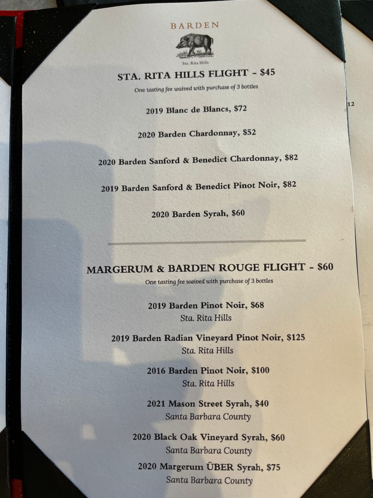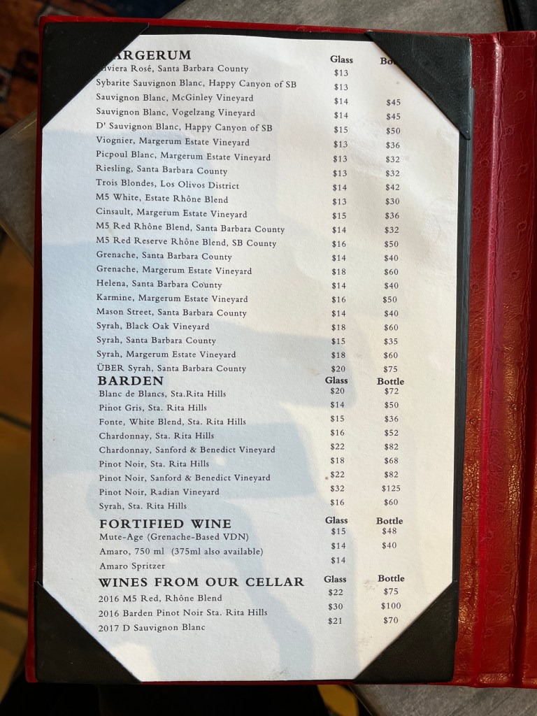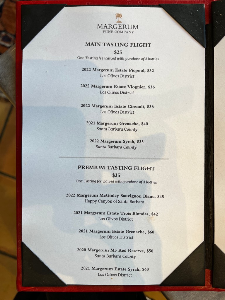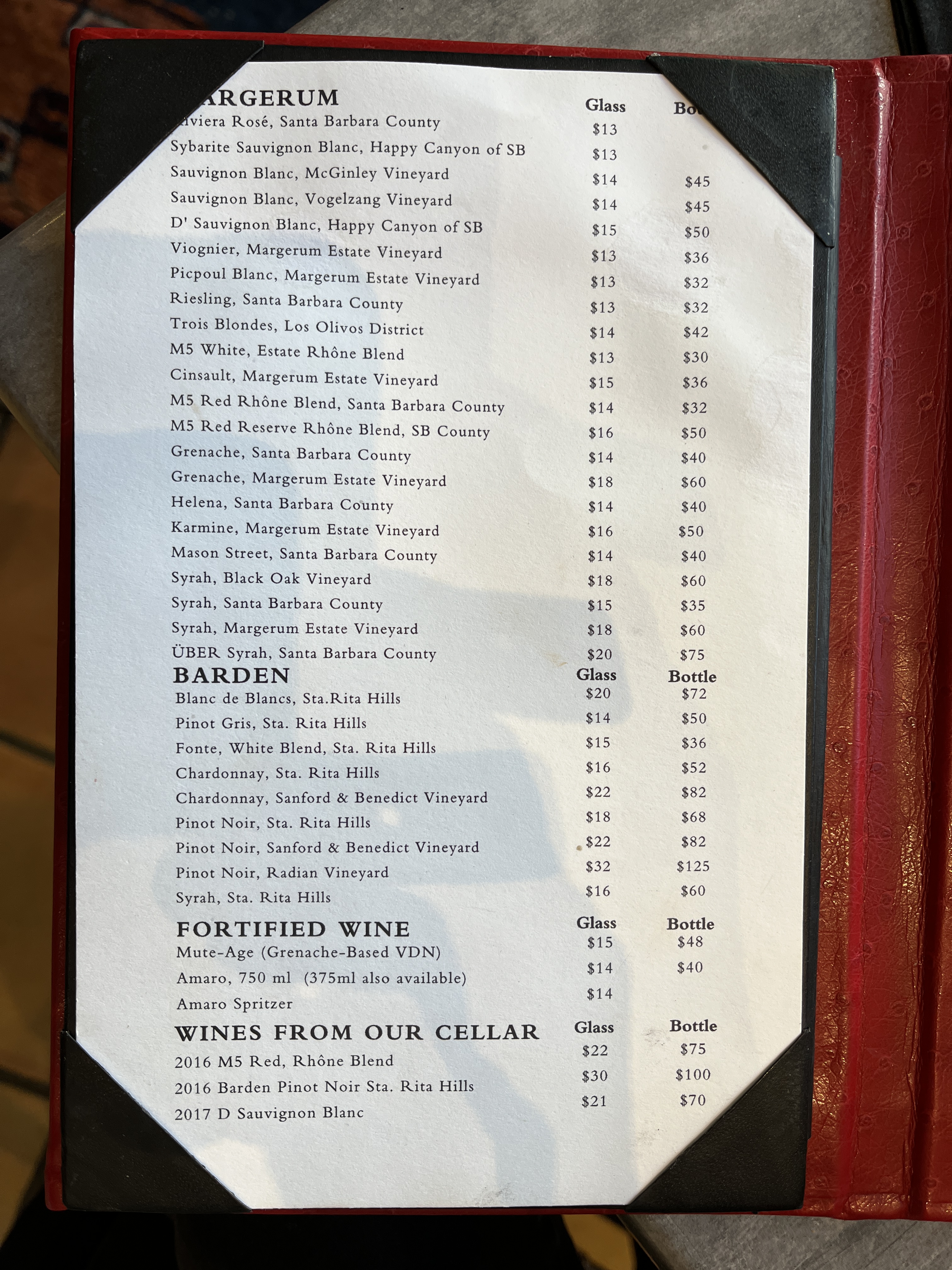 Our host Lisa could not have been more engaging and knowledgeable about Margerum’s wines making our visit so pleasant and difficult to leave. We shared an impressive charcuterie plate (I can highly recommend) with flights of the wines. Our favorites were the 2022 Estate Cinsault, the 2021 Estate Grenache, and the 2020 M5 Red Reserve. Getting your hands on bottles of Margerum’s wines would likely require ordering online or visiting except for their entry level M5 (a Rhône varietal red blend) which is widely distributed.