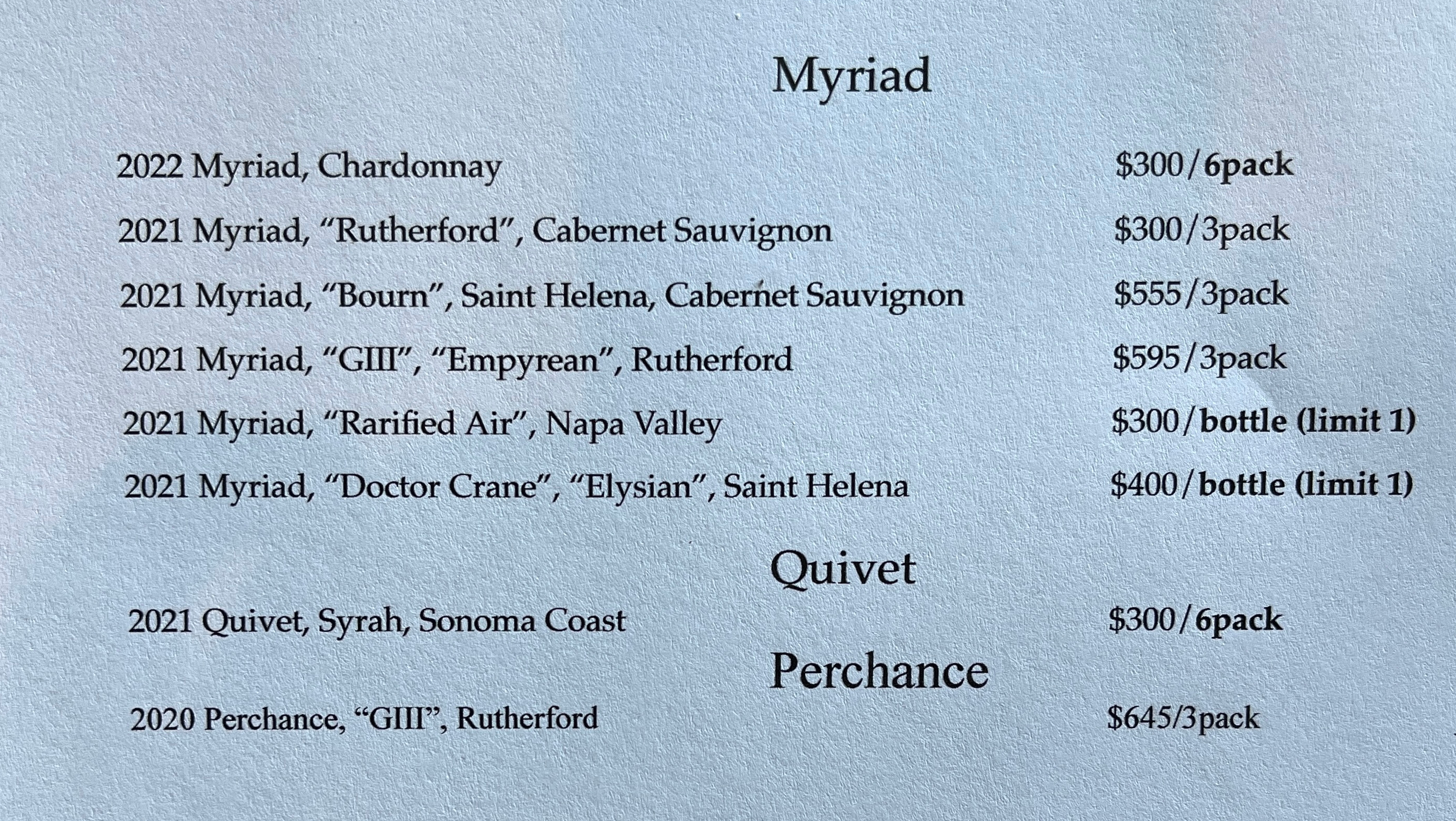Plan ahead if you are coming to Napa and make an appointment at Myriad to taste. Not only are the wines incredible, the tasting charge is a bargain by Napa’s standards and best of all, you might even have the winemaker pouring for you! But ….If you aren’t able to come to Napa to taste and purchase, signing up to their mailing list is your best bet for obtaining their wines.