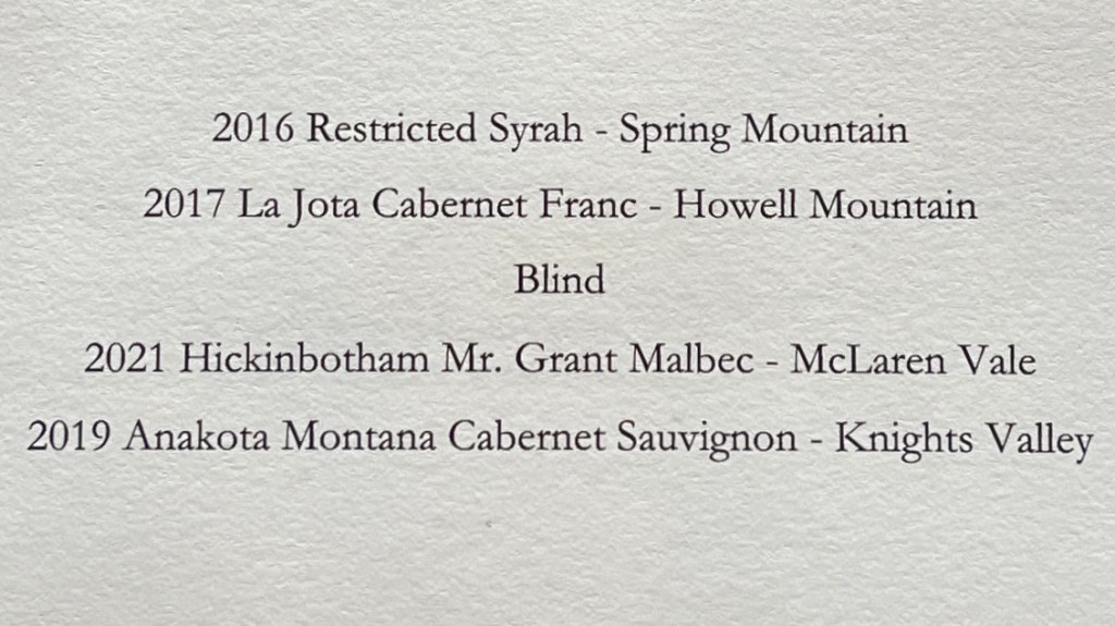 The blind wine was a 100% Cabernet Franc 2016 Arcanum – Super Tuscan. In addition to it and the other tasting selections, we tried a 2021 Anakota. Both the Montana and Dakota vineyard grapes were used in this blend producing a very, very smooth wine.