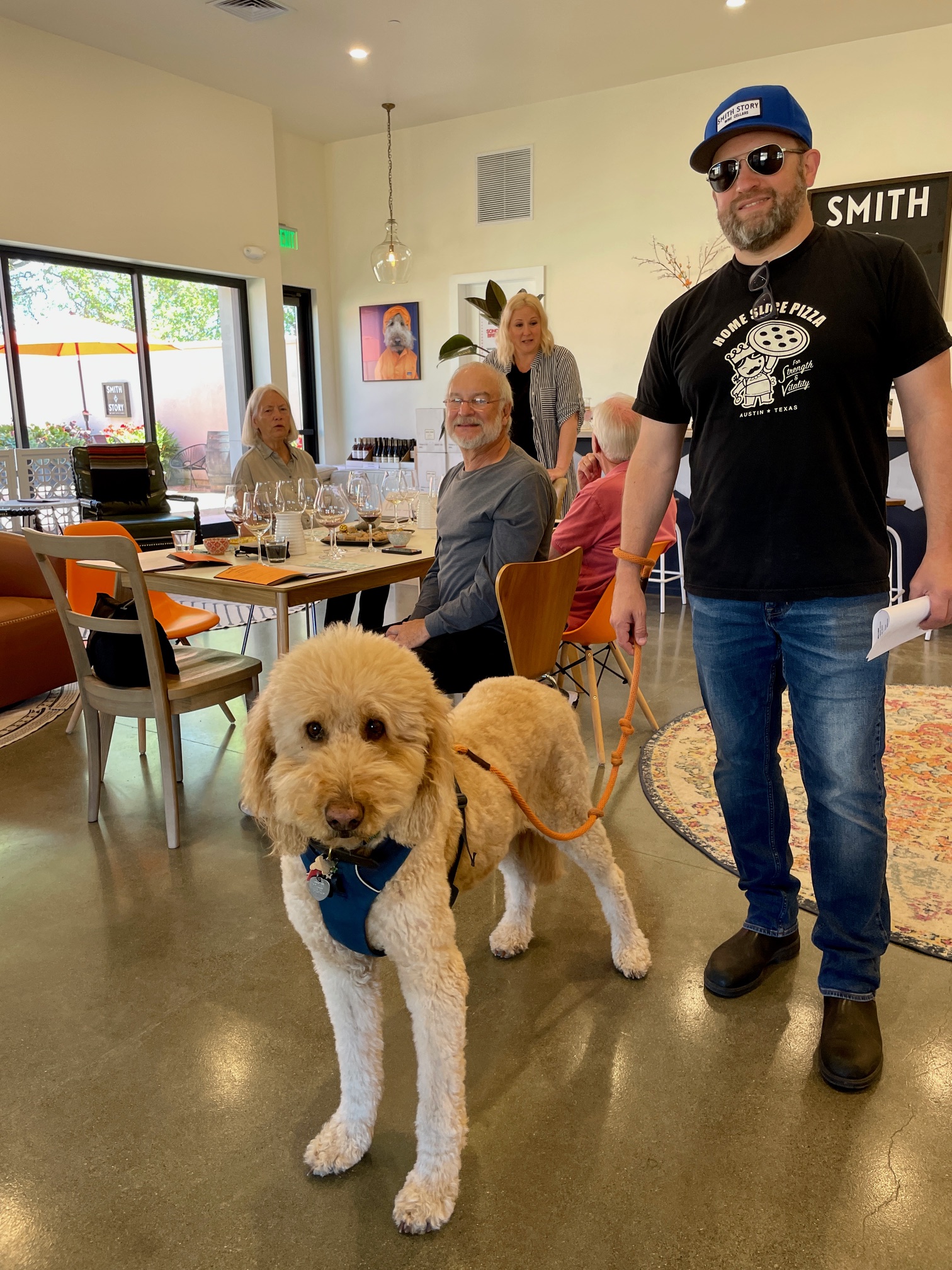 Ali Smith and Eric Story are the couple behind the wine. Katy Wilson is their consulting winemaker and Dusty Rhodes their hospitality director. And not to be left out in any way is Lord Sandwich, the canine behind it all.