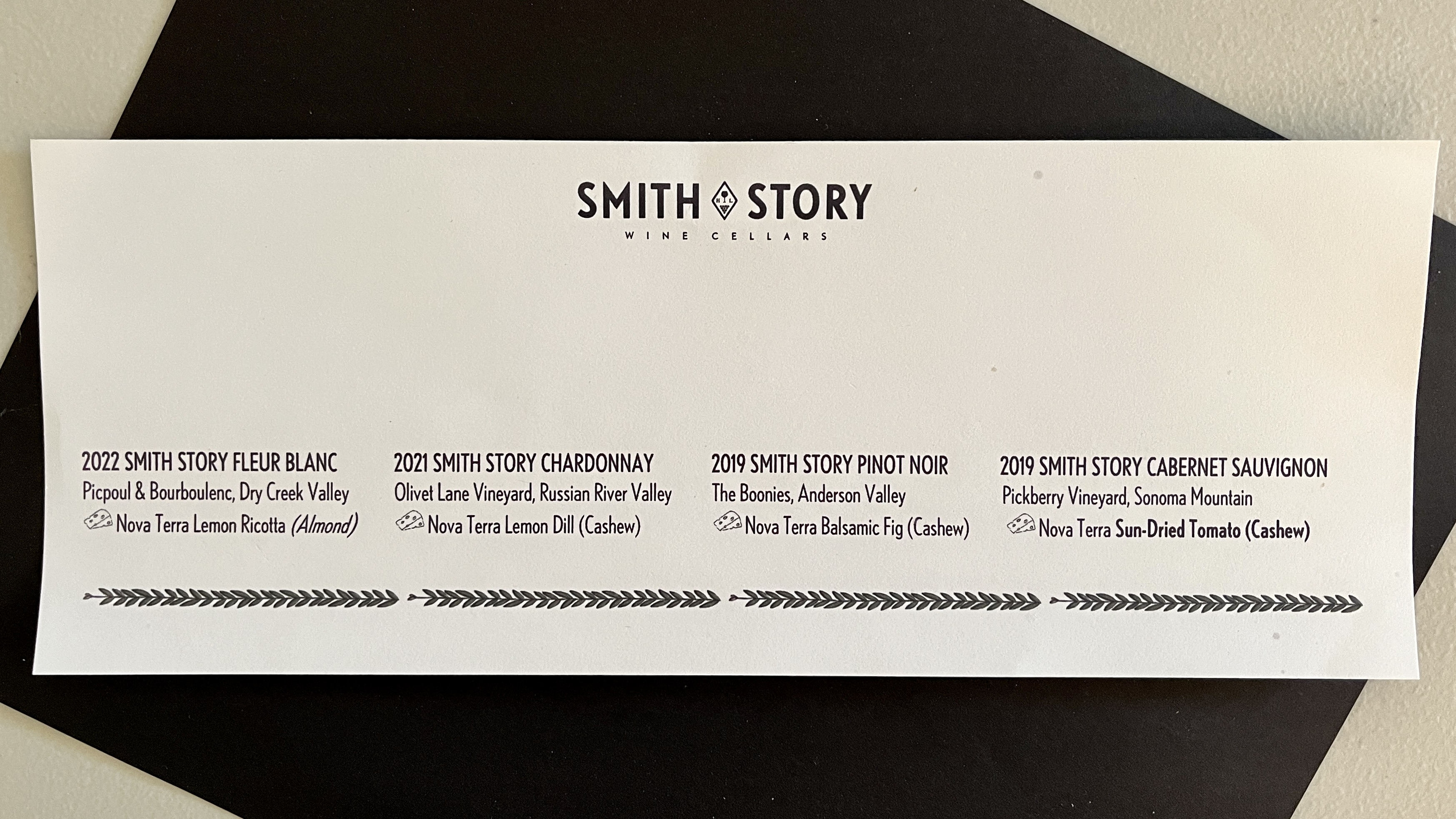 A note about the cheeses: Smith Story and Nova Terra Artisan Plant Based Creamery have teamed together to provide this special pairing . It was a hit for us. We will look forward to trying more of their cheese products and more of Smith Story wines!