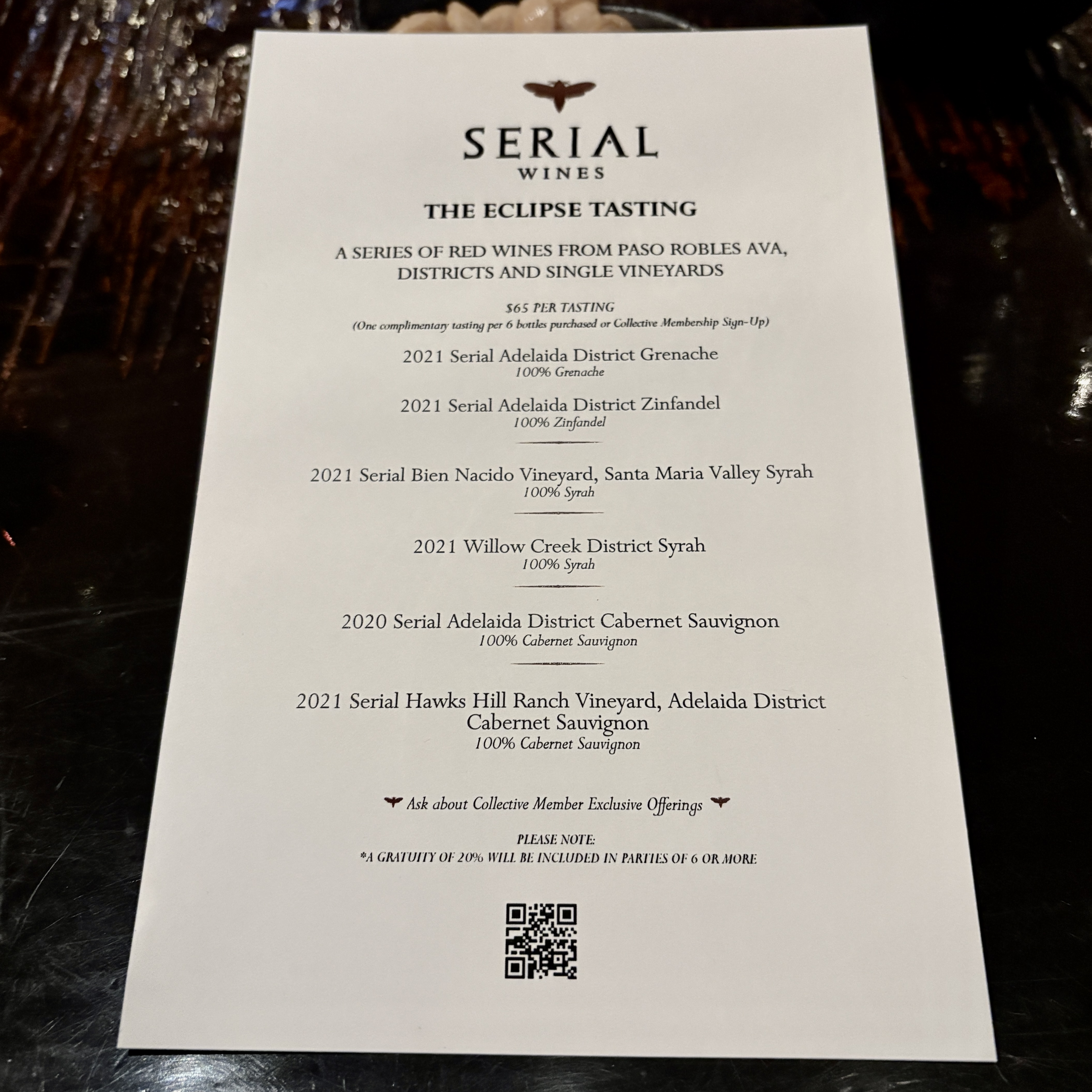 Serial Wines tasting room is just off the square in downtown Paso Robles with a very fun, contemporary and comfortable ambiance. It seemed a particularly perfect place to enjoy our first tasting before dinner.