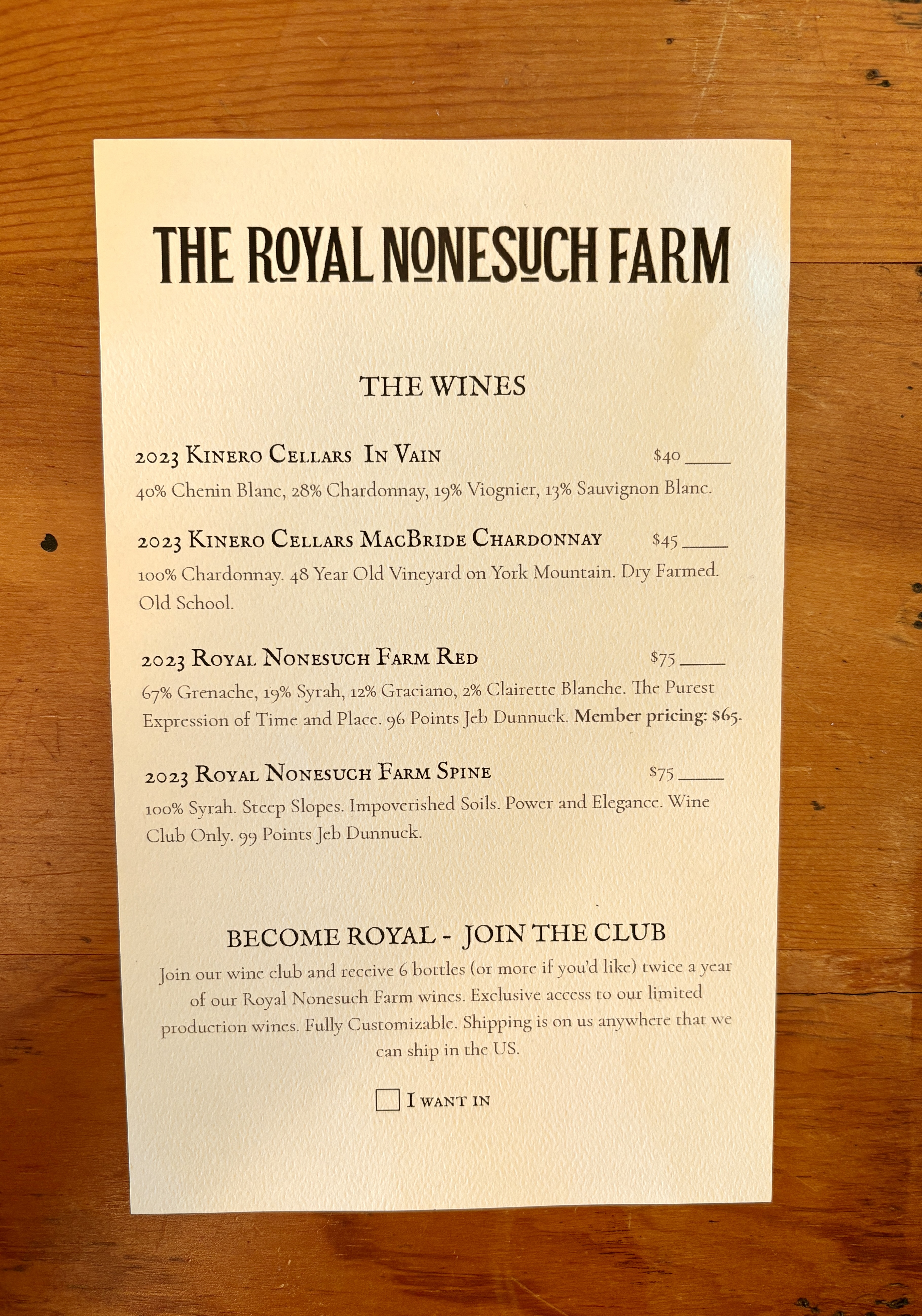 Truly a visit here is about as perfectly down home and fun as it gets. The wine is honestly amazing too! We picked up our allocation and additional purchases of the 2023 Royal Nonesuch Farm Spine and a reload on the 2021 Red Wine, and headed back into Paso Robles.