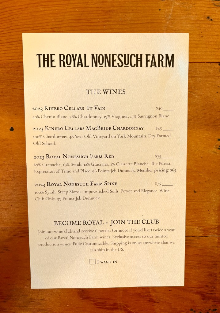 Following our visit at Booker we stopped at The Royal Nonesuch Farm for a visit in their new tasting room. Anthony Yount is the owner, winemaker. He learned winemaking at Denner where he was head winemaker for many years. He continues to act as consulting winemaker for them now, as well as other consulting and acting as winemaker for Hawk’s Hill Ranch. Anthony started making his own wine under the label – Kinero at Denner and subsequently launched The Royal Nonesuch Farm with his wife Hillary. We have enjoyed his wines for years starting with the 2019 vintage.