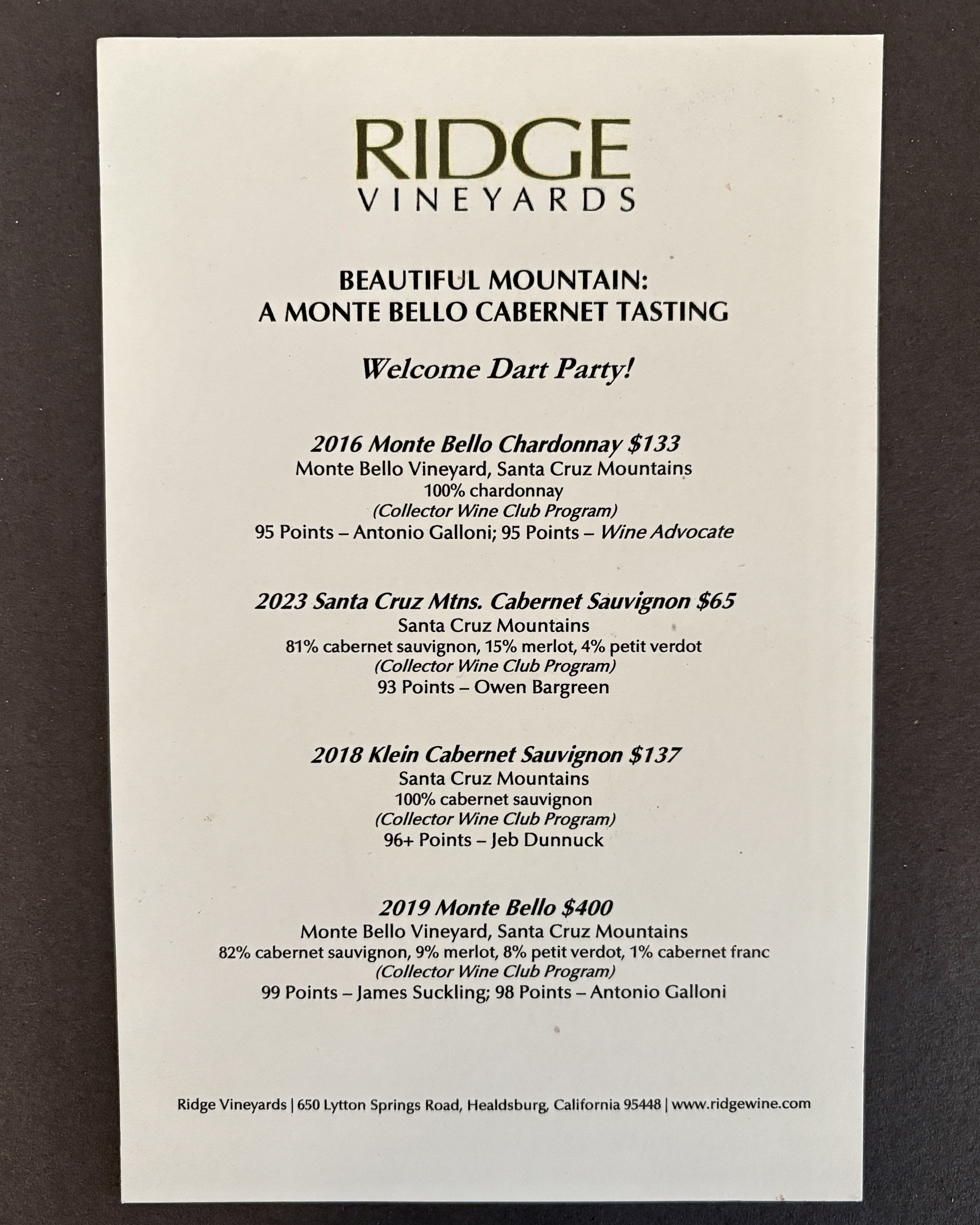 Ridge Vineyards is the producer of some of our favorite wines. We’ve enjoyed them since the 1980’s getting their shipments in Florida and coming out to visit initially at their first estate – Monte Bello in Cupertino.