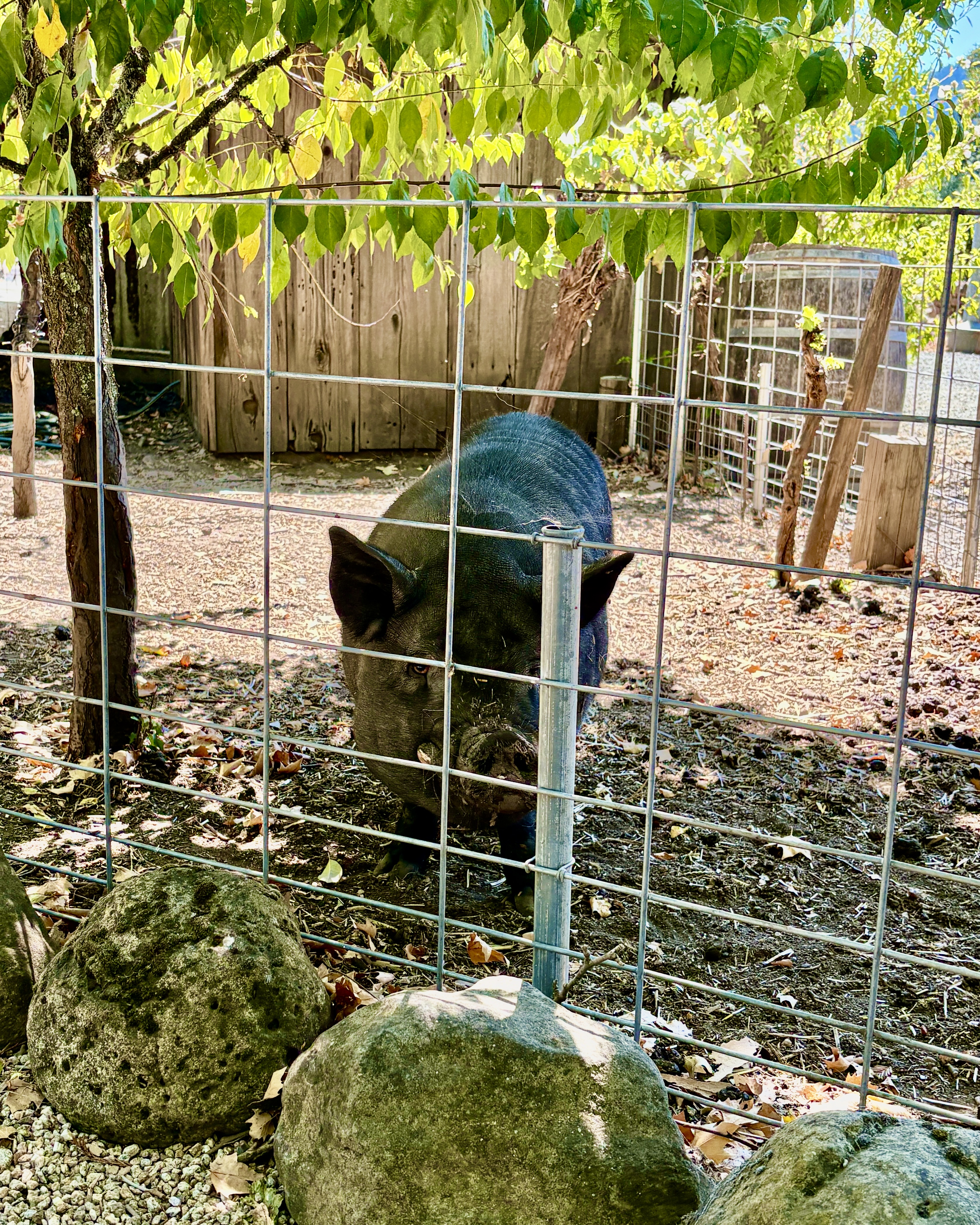 Their home and small barn tasting facility are surrounded by beautiful gardens and vineyards on all sides. When you arrive there are two rather robust rescue pigs to greet you and a blond lab that appears to be quite used to playing second fiddle to the pigs.